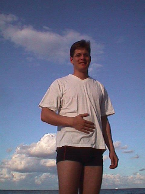 Ich auf Usedom, nach dem Baden, meinen dicken Bauch streichelnd